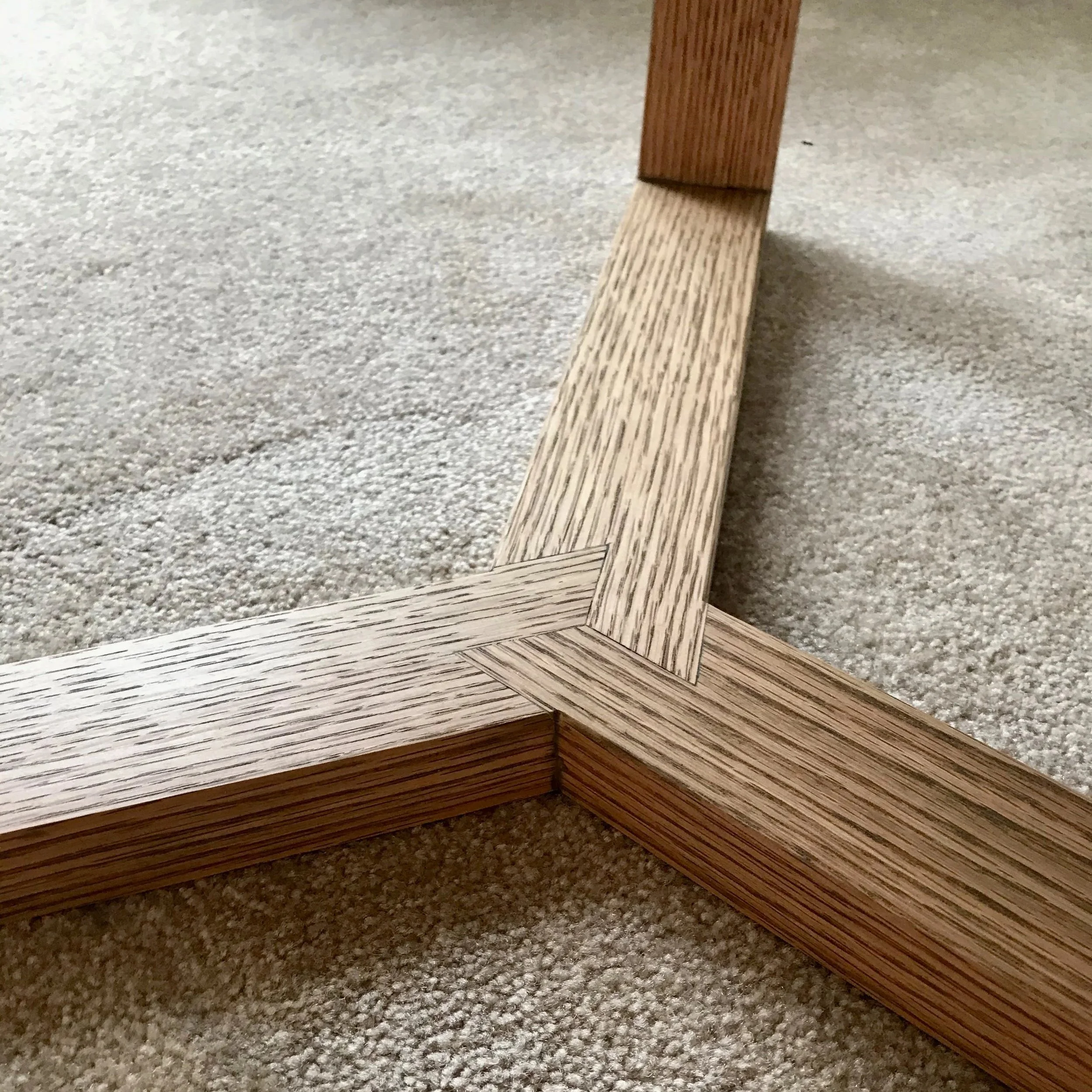 The base of this solid white oak table features a unique three-member mitered lap joint (see detail photos). The three points fan out to create three equally spaced 120 degree angles—complementing the circular top. The top has a 60 degree relief chamfer to give the appearance of thinness, while maintaining a strong, substantial surface. Finished with oil.